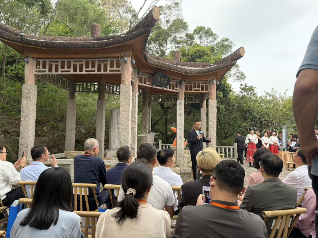 大会在秦君亭周边布置了竹制座椅,嘉宾们围坐于古亭之下,在苍翠山林间展开深度交流。古亭石柱上刻有对联,亭内立有石碑,处处彰显着九日山深厚的历史文化底蕴。会场还设置了专业的同声传译帐篷,技术人员在帐篷内通过笔记本电脑和通讯设备,为国际嘉宾提供实时翻译服务,保障了跨文化交流的顺畅进行。